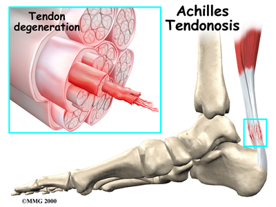 Las lesiones del Aquiles pueden ser agudas (repentinas ) como la ruptura completa por sobrecarga repentina. Pero también, y mucho más frecuentemente, lo que se producen son múltiples pequeñas microrroturas de las fibras de colágeno a las cuales no damos tiempo a reparar, porque seguimos activos y la molestia no es suficientemente incapacitante. O que se reparan formando cicatrices que se “pegan” al paratendón y  que forman calcificaciones y nódulos  en su seno. Estamos entonces,  hablando de degeneración tendinosa con falta de vascularización del tendón. Muchos pacientes nos cuentan que el dolor mejora cuando llevan un tiempo corriendo o andando. Esto generalmente se debe a un aumento de vascularización (de llegada de sangre) a la zona y por tanto,  a un aumento de temperatura que distiende las estructuras y las alivia. Mucha gente lo denomina como “una vez que caliento mejoro algo….”. Pero esto no siempre es así, y cuando se ignora el dolor se forman cicatrices duras que impiden la elasticidad del tendón y al final provocan molestias continuas.